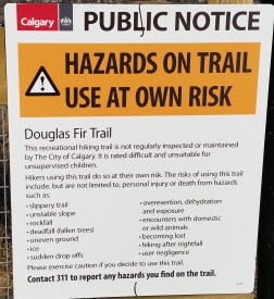 The City of Calgary Website http://www.calgary.ca/CSPS/Parks/Pages/Locations/SW-parks/Douglas-Fir-Trail.aspx does mention that “Because of extremely icy conditions, the trail is closed in winter and early spring.” A map posted at one of the entrances to the trail also advises of pathway closure during winter.